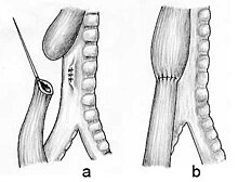In a minority of cases, the gap between upper and lower esophageal segments may be too long to bridge. In these situations traditional surgical approaches include gastrostomy followed by gastric pull-up, colonic transposition and jejunum transposition.[16] Gastric pull-up has been the preferred approach at many specialized centers, including Great Ormond Street (London) and Mott Children's Hospital (Ann Arbor).[17] Gastrostomy, or G-tube, allows for tube feedings into the stomach through the abdominal wall. Often a cervical esophagostomy will also be done, to allow the saliva which is swallowed to drain out a hole in the neck. Months or years later, the esophagus may be repaired, sometimes by using a segment of bowel brought up into the chest, interposing between the upper and lower segments of esophagus.[18]
