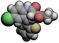 Ethyl loflazepate[2] (marketed under the brand names Meilax, Ronlax and Victan)[3][4][5] is a drug which is a benzodiazepine derivative. It possesses anxiolytic, anticonvulsant, sedative and skeletal muscle relaxant properties.[6] In animal studies it was found to have low toxicity, although in rats evidence of pulmonary phospholipidosis occurred with pulmonary foam cells developing with long-term use of very high doses.[7] Its elimination half-life is 51–103 hours.[8] Its mechanism of action is similar to other benzodiazepines. Ethyl loflazepate also produces an active metabolite which is stronger than the parent compound.[9] Ethyl loflazepate was designed to be a prodrug for descarboxyloflazepate, its active metabolite. It is the active metabolite which is responsible for most of the pharmacological effects rather than ethyl loflazepate.[10] The main metabolites of ethyl loflazepate are descarbethoxyloflazepate, loflazepate and 3-hydroxydescarbethoxyloflazepate.[11] Accumulation of the active metabolites of ethyl loflazepate are not affected by those with kidney failure or impairment.[12] The symptoms of an overdose of ethyl loflazepate include sleepiness, agitation and ataxia. Hypotonia may also occur in severe cases. These symptoms occur much more frequently and severely in children.[13] Death from therapeutic maintenance doses of ethyl loflazepate taken for 2 – 3 weeks has been reported in 3 elderly patients. The cause of death was asphyxia due to benzodiazepine toxicity.[14] High doses of the antidepressant fluvoxamine may potentiate the adverse effects of ethyl loflazepate.[15]