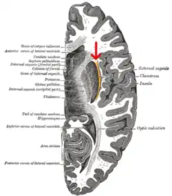 ![]() Horizontal section of right cerebral hemisphere. (external capsule shown in orange, indicated by red arrow.) | |