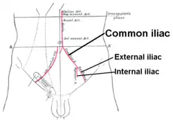 Bifurcation of the aorta and the right common iliac artery - side view. (External iliac artery is artery at upper left, seen splitting from common iliac artery at top.)