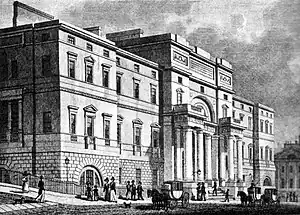Extramural teaching resumed in the late 18th century. James Rae, a surgeon who became president of the RCSEd, lectured on anatomy, surgery and dentistry at Surgeons' Hall from 1772.[10] From 1779 John Aitken began to teach classes in anatomy, physiology, surgery and midwifery at the Anatomical Theatre in Surgeons' Square, which was probably in Old Surgeons' Hall. The surgeon John Bell taught anatomy in his house in the square from 1787 and was joined then succeeded by his brother Charles Bell, later professor of surgery at the University of London. Their classes attracted large number of students as they taught surgical anatomy in contrast to Alexander Monro secundus, the university professor of anatomy, who was not a practising surgeon.[1]