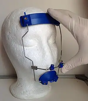 A facemask (also referred to as a protraction facemask, orthopedic facemask, or reverse-pull headgear) is a type of an orthodontic headgear used to treat underbite and other malocclusions where the upper jaw is too far backwards.[1] A metal bar sits in front of the patients face with support from the forehead and chin. Elastics are connected to the metal bar and the teeth - directly through the lips / mouth of the patient. The elastics apply forward and downward pressure on the upper jaw. Thus the force direction is the opposite from a standard headgear which is why this appliance is also known as a reverse-pull-headgear. [1]