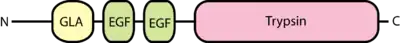 Factors VII, IX, and X all play key roles in blood coagulation and also share a common domain architecture.[10] The factor IX protein is composed of four protein domains: the Gla domain, two tandem copies of the EGF domain and a C-terminal trypsin-like peptidase domain which carries out the catalytic cleavage.