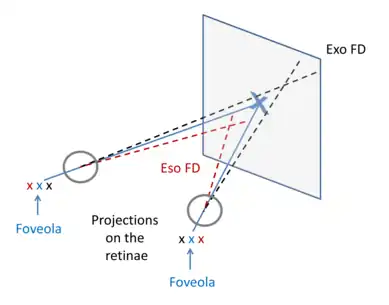 Fixation disparity is a tendency of the eyes to drift in the direction of the heterophoria. While the heterophoria refers to a fusion-free vergence state, the fixation disparity refers to a small misalignment of the visual axes when both eyes are open in an observer with normal fusion and binocular vision.[1] The misalignment may be vertical, horizontal or both. The misalignment (a few minutes of arc) is much smaller than that of strabismus. While strabismus prevents binocular vision, fixation disparity keeps binocular vision, however it may reduce a patient's level of stereopsis. A patient may have a different fixation disparity at distance than near. Observers with a fixation disparity are more likely to report eye strain in demanding visual tasks; therefore, tests of fixation disparity belong to the diagnostic tools used by eye care professionals:[2][3][4][5][6] remediation includes vision therapy, prism eye glasses, or visual ergonomics at the workplace.
