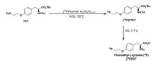 Second route of radiosynthesis is a direct nucleophilic 18F-fluorination a TET (O-(2-tosyloxy-ethyl)-N-trityl-L-tyrosine tertbutylester) pretected precursor followed by acidic hydrolysis of protecting groups. [3][4][7] Schematic for this pathway is presented in Figure 2.[6]