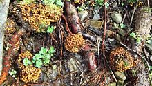 In culture and in some root nodules, multilocular sporangia containing many spores are produced.[9] The sporangia are non-motile but the spores can migrate to infect new host plants.[10] A Swedish study found that root nodules developed on transplanted seedlings of the grey alder, Alnus incana, planted in meadow soil that had not grown actinorhizal plants for nearly sixty years. A similar experiment planting seedlings in deep layers of peat where the surface layer had been removed, did not produce nodulation. This seems to have been because there were no infective propagules of Frankia alni deep in the peat. No air-borne dispersal of Frankia alni was detected and it was thought that movement of water might account for the dispersal of the bacteria in peat soils.[11]