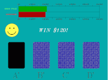 This test has an inverse relationship between the probability of obtaining a reward and the value of the reward itself; that is to say, a low probability but a high reward or a high probability but a low reward.[7] Thus, actual gambling skills are not being tested, but simply the preference for high reward despite the risks. In one of the ways to carry this out, a set of cards will be presented face down to the individual being tested; one of the cards would be the winning card, and all the others, losers. Cards will then be continuously removed from the pile and added back in randomly, during which time the winning card could be anywhere. Subjects being tested are told they can stop the process at any time and have the cards flipped over; if the winning card is present within the pile they win points. The catch, however, is that more points are awarded when fewer cards are present; but when fewer cards are present, the probability of the winning card being within the pile is lesser. Risk takers are those that go for the higher reward (more points), even though they are less likely to actually receive that reward. They choose a higher, less likely award, over a lower, more probable reward. Subjects that have experienced a frontal lobe injury show just such behavior when tested.