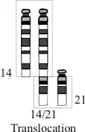 Translocation Down syndrome can be de novo; that is, not inherited but occurring at the time of an individual's conception, or may be inherited from a parent with a balanced translocation. The balanced translocation figure shows a 14/21 translocation between the long arms of chromosomes 14 and 21, where the other chromosomes are not shown. The individual has two copies of everything on chromosome 14, and two copies of all of the material on the long arm of chromosome 21 (21q). The derivative chromosome 21, which contains only heterochromatin, is lost; thus, the individual only has one copy of the material on the short arm of chromosome 21 (21p), but this appears to have no discernible effect. Individuals with this chromosomal arrangement have 45 chromosomes and are phenotypically normal. During meiosis, the chromosomal arrangement interferes with normal separation of chromosomes. Possible gametic arrangements are (see translocation karyotype figure):