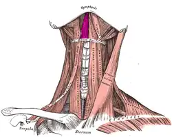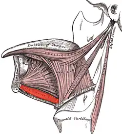 The geniohyoid is a paired short muscle that arises from the inferior mental spine, on the back of the mandibular symphysis, and runs backward and slightly downward, to be inserted into the anterior surface of the body of the hyoid bone.[2]: 346 It lies in contact with its fellow of the opposite side. It thus belongs to the suprahyoid muscles. The muscle receives its blood supply from branches of the lingual artery.[3]
