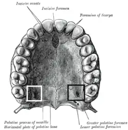 The greater palatine foramen is, along with the lesser palatine foramen, one of two foramina (holes) in each of the left and right palatine bones which form the posterior roof of the human mouth, known as the palate. It is sometimes known as the major palatine foramen.