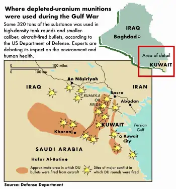 The Gulf War included the first widespread combat usage of depleted uranium (DU), in tank kinetic energy penetrator and autocannon rounds.[39] DU has been suggested as a possible cause of Gulf War syndrome.[40]