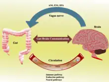 The gut–brain axis is the two-way biochemical signaling that takes place between the gastrointestinal tract (GI tract) and the central nervous system (CNS).[2] The term "microbiota–gut–brain axis" highlights the role of gut microbiota in these biochemical signaling.[3][2] Broadly defined, the gut–brain axis includes the central nervous system, neuroendocrine system, neuroimmune systems, the hypothalamic–pituitary–adrenal axis (HPA axis), sympathetic and parasympathetic arms of the autonomic nervous system, the enteric nervous system, vagus nerve, and the gut microbiota.[2]