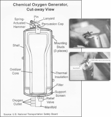 Commercial aircraft provide emergency oxygen to passengers to protect them in case of loss of cabin pressure. The cockpit crew are typically supplied from compressed oxygen cylinders. The oxidizer core is sodium chlorate (NaClO3), which is mixed with less than 5 percent barium peroxide (BaO2) and less than 1 percent potassium perchlorate (KClO4). The explosives in the percussion cap are a lead styphnate and tetrazene explosive mixture. The chemical reaction is exothermic and the exterior temperature of the canister will reach 260 °C (500 °F). It will produce oxygen for 12 to 22 minutes.[23][24]