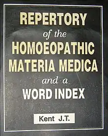 Homeopathic preparations are referred to as "homeopathic remedies".[82] Practitioners rely on two types of reference when prescribing: Materia medica and repertories. A homeopathic materia medica is a collection of "drug pictures", organized alphabetically. A homeopathic repertory is a quick reference version of the materia medica that indexes the symptoms and then the associated remedies for each. In both cases different compilers may dispute particular inclusions in the references.[83] The first symptomatic homeopathic materia medica was arranged by Hahnemann. The first homeopathic repertory was Georg Jahr's Symptomenkodex, published in German in 1835, and translated into English as the Repertory to the more Characteristic Symptoms of Materia Medica in 1838. This version was less focused on disease categories and was the forerunner to later works by James Tyler Kent.[84][85] There are over 118 repertories published in English, with Kent's being one of the most used.[86]