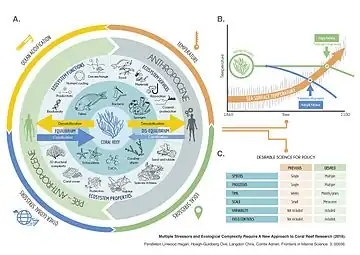 - ↑ Pendleton, L. H., Hoegh-Guldberg, O., Langdon, C. and Comte, A. (2016) "Multiple stressors and ecological complexity require a new approach to coral reef research". Frontiers in Marine Science, 3: 36. doi:10.3389/fmars.2016.00036.