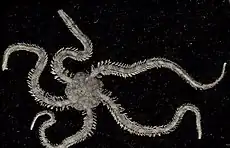 Pteropods and brittle stars together form the base of the Arctic food webs and both are seriously damaged by acidification. Pteropods shells dissolve with increasing acidification and brittle stars lose muscle mass when re-growing appendages.[115] Additionally the brittle star's eggs die within a few days when exposed to expected conditions resulting from Arctic acidification.[116] Acidification threatens to destroy Arctic food webs from the base up. Arctic waters are changing rapidly and are advanced in the process of becoming undersaturated with aragonite.[108] Arctic food webs are considered simple, meaning there are few steps in the food chain from small organisms to larger predators. For example, pteropods are "a key prey item of a number of higher predators – larger plankton, fish, seabirds, whales".[117]