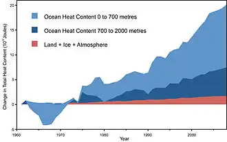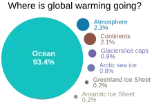 Most heat energy from global warming goes into the ocean, and not into the atmosphere or warming up the land.[49][50] Scientists realized over 30 years ago the ocean was a key fingerprint of human impact on climate change and "the best opportunity for major improvement in our understanding of climate sensitivity is probably monitoring of internal ocean temperature".[51]