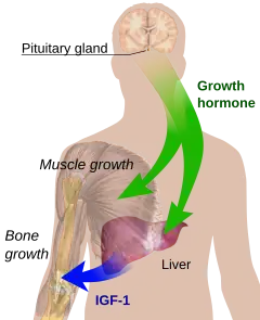 The hypothalamic–pituitary–somatotropic axis (HPS axis), or hypothalamic–pituitary–somatic axis, also known as the hypothalamic–pituitary–growth axis, is a hypothalamic–pituitary axis which includes the secretion of growth hormone (GH; somatotropin) from the somatotropes of the pituitary gland into the circulation and the subsequent stimulation of insulin-like growth factor 1 (IGF-1; somatomedin-1) production by GH in tissues such as, namely, the liver.[1][2][3] Other hypothalamic–pituitary hormones such as growth hormone-releasing hormone (GHRH; somatocrinin), growth hormone-inhibiting hormone (GHIH; somatostatin), and ghrelin (GHS) are involved in the control of GH secretion from the pituitary gland.[1] The HPS axis is involved in postnatal human growth.[1] Individuals with growth hormone deficiency or Laron syndrome (GHR insensitivity) show symptoms like short stature, dwarfism and obesity, but are also protected from some forms of cancer.[4][5] Conversely, acromegaly and gigantism are conditions of GH and IGF-1 excess usually due to a pituitary tumor, and are characterized by overgrowth and tall stature.[6][7]
