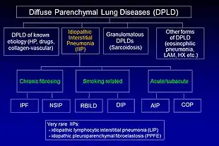 Idiopathic pulmonary fibrosis (IPF) belongs to a large group of more than 200 lung diseases known as interstitial lung diseases (ILDs), which are characterized by the involvement of the lung interstitium,[10] the tissue between the air sacs of the lung. IPF is one specific presentation of idiopathic interstitial pneumonia (IIP), which is in turn a type of ILD, also known as diffuse parenchymal lung disease (DPLD).