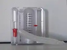 ![]() A typical incentive spirometer consists of an inhalation nozzle, which is seen facing toward the camera. The curved plastic on the left is a handle. The piston is in the middle (along with an adjustable mark to indicate a goal), and on the right side is a flow indicator showing whether the patient is inhaling too rapidly. | |