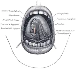 ![]() The mouth cavity. (Longitudinalis inferior labeled at bottom left.) | |
