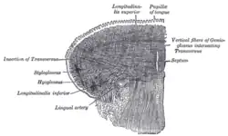 The inferior longitudinal muscle of tongue is an intrinsic muscle of the tongue.[1] It is situated on the under surface of the tongue between the genioglossus and hyoglossus. It is innervated by the hypoglossal nerve (cranial nerve XII). Its contraction shortens and thickens the tongue.