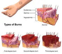 Burn injury is caused by contact with extreme temperature, chemicals, or radiation. The effects of burns vary depending on the depth and size. Superficial or first-degree burns only affect the epidermis, causing pain for a short period of time. Superficial partial-thickness burns cause weeping blisters and require dressing. Deep partial-thickness burns are dry and less painful due to the burning away of the skin and require surgery. Full-thickness or third-degree burns affect the entire dermis and is susceptible to infection. Fourth-degree burns reach deep tissues such as muscles and bones, causing loss of the affected area.[15]