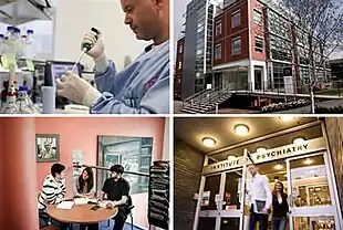 The Maurice Wohl Clinical Neuroscience Institute focuses on the development of new treatments to patients affected by neurodegenerative diseases (such as Alzheimer's disease, Parkinson's disease and motor neurone disease), mental disorders (depression, schizophrenia) and neurological diseases (including epilepsy and stroke), and the understanding of disease mechanisms.[11][10] The research institute has 250 clinicians and research scientists from neuroimaging, neurology, psychiatry, genetics, molecular and cellular biology and drug discovery.[10]