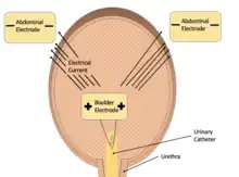Electromotive drug administration utilizes a small electric current flowing across the bladder wall between two electrodes, one on the skin and one placed inside the bladder via catheterization, to enhance permeability of aqueous solutions.[1][2][3] Electromotive drug administration best enhances ionized formulations, which diffuse poorly using standard passive diffusion.[3] This allows it to potentially assist in the delivery of many drugs that usually perform poorly in the bladder without having to change their formulations heavily. Across multiple studies and clinical trials electromotive drug administration has been shown to increase the uptake of many drugs, showing potential use in bladder cancer, urinary incontinence, urinary cystitis and pain management.[1][2][3][5] Cost of local anesthesia for bladder distention using electromotive drug administration in combination with lidocaine has been shown to be cheaper and more practical than general anesthesia or spinal anesthesia.[5]