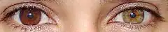 Heterochromia (also known as a heterochromia iridis or heterochromia iridum) is an ocular condition in which one iris is a different color from the other iris (complete heterochromia), or where the part of one iris is a different color from the remainder (partial heterochromia or sectoral heterochromia). Uncommon in humans, it is often an indicator of ocular disease, such as chronic iritis or diffuse iris melanoma, but may also occur as a normal variant. Sectors or patches of strikingly different colors in the same iris are less common. Anastasius the First was dubbed dikoros (having two irises) for his patent heterochromia since his right iris had a darker color than the left one.[10][11]