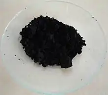 Iron(II,III) oxide, or black iron oxide, is the chemical compound with formula Fe3O4. It occurs in nature as the mineral magnetite. It is one of a number of iron oxides, the others being iron(II) oxide (FeO), which is rare, and iron(III) oxide (Fe2O3) which also occurs naturally as the mineral hematite. It contains both Fe2+ and Fe3+ ions and is sometimes formulated as FeO ∙ Fe2O3. This iron oxide is encountered in the laboratory as a black powder. It exhibits permanent magnetism and is ferrimagnetic, but is sometimes incorrectly described as ferromagnetic.[5] Its most extensive use is as a black pigment (see: Mars Black). For this purpose, it is synthesized rather than being extracted from the naturally occurring mineral as the particle size and shape can be varied by the method of production.[6]