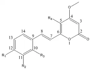 - ↑ Ligresti A, Villano R, Allarà M, et al. (2012). "Kavalactones and the endocannabinoid system: the plant-derived yangonin is a novel CB₁ receptor ligand". Pharmacol. Res. 66 (2): 163–9. doi:10.1016/j.phrs.2012.04.003. PMID 22525682.
