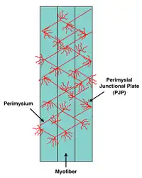 - ↑ Passerieux, E., Rossignol, R., Chopard, A., Carnino, A., Marini, J.F., Letellier, T., Delage, J.P. (2006). Structural organization of the perimysium in bovine skeletal muscle: Junctional plates and associated intracellular subdomains, J Struct Biol, 154 (2), 206-216.