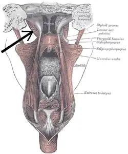 During its course from its origin to its insertion, the muscle passes medial to the superior margin of the superior pharyngeal constrictor muscle.[2]