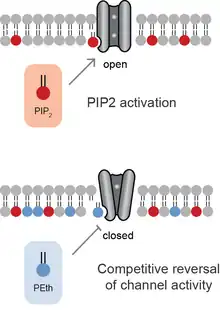 Anionic lipids compete for binding sites within ion channel. Similar to neurotransmitters, competition of an antagonist reverses the effect of an agonist. In most cases, the PA has the opposite effect of PIP2.[9] Hence when PA binds to a channel that is activated by PIP2, PA inhibits the effect of PIP2. When PA activates the channel, PIP2 blocks the effect of PA inhibiting the channels.