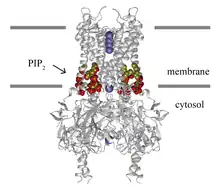 - ↑ Hansen SB, Tao X, MacKinnon R (August 2011). "Structural basis of PIP2 activation of the classical inward rectifier K+ channel Kir2.2". Nature. 477 (7365): 495–8. Bibcode:2011Natur.477..495H. doi:10.1038/nature10370. PMC 3324908. PMID 21874019.