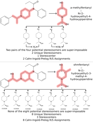 This procedure will be used when making an assessment of the number of valid stereoisomers that an analogue of fentanyl will be predicted to have. Because the analogues of fentanyl are so large, and the moieities (sub-regions) of the molecule that are relevant to its chirality are so small, that we often reproduce the fentanyl analogue as a smaller, simpler molecule with the same number of, and dynamics between its, stereocenters. This saves significant space allowing us not to reproduce redundant material that consumes a lot of space on the image.