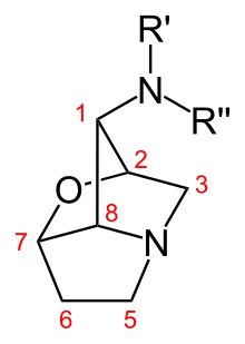 A member of the loline alkaloids was first isolated from the grass Lolium temulentum and its elemental composition determined in 1892. It was initially named temuline and later renamed norloline. (Reviewed by Schardl et al. (2007).)[1] Studies in the 1950s and 1960s by Russian researchers established the name loline and identified the characteristic 2,7 ether bridge in its molecular structure.[1] Since then the analytical methods for purification and analysis of the lolines have been refined and several different loline species have been identified in many Lolium and related grasses infected by the Epichloë/Neotyphodium (epichloae) endophytes.[2][3] Lolines are absent in grass plants that do not harbor the epichloae endophytes, and not all epichloae produce the lolines.[1] Because of the very intimate association of plant and endophyte and difficulties to reproduce the symbiotic conditions in vitro, it was long unknown if the fungus was the producer of the lolines, or if they were synthesized by the plant in response to endophyte infection. In 2001, it was demonstrated that the endophyte Neotyphodium uncinatum produces lolines in some chemically defined growth media,[4] which suggests that the endophyte is also the producer of the lolines in the grass plant. The lolines have also been reported from some plants in several plant families,[5][6] suggesting a more widespread occurrence of these compounds in nature.