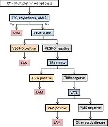 If none of these clinical features are present, a biopsy may be necessary to make the diagnosis. Video-assisted thoracoscopic lung biopsy is the most definitive technique, but transbronchial biopsy has a yield of over 50% and can also be effective.[82][83] The safety of the latter procedure in patients with diffuse cystic disease and the profusion of cystic change that predicts an informative biopsy are incompletely understood, however. Cytology of chylous fluids, aspirated abdominal nodes or lymphatic masses can also be diagnostic.[63][84][85][86]