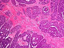 Histological traits include a pronounced nodular (lobular) pattern. Normally, there is no link between the epidermis and the tumour, but the superficial epithelium may become ulcerated.[1] The tumour may have enhanced mitotic activity and localized regions of necrosis.[8][9]