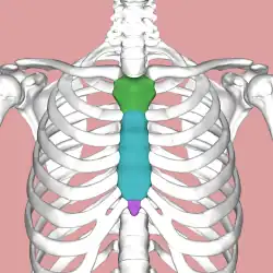 ![]() Parts of the sternum: manubrium (green), body (blue), xiphoid process (purple) | |