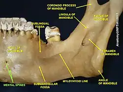 A mental spine is a small projection of bone on the posterior aspect of the mandible in the midline. There are usually four mental spines: two superior and two inferior. Collectively they are also known as the genial tubercle,[1] genial apophysis and the Latin name spinae mentalis. The inferior mental spines are the points of origin of the geniohyoid muscle,[2] one of the suprahyoid muscles, and the superior mental spines are the origin of the genioglossus muscle, one of the muscles of the tongue. Mental spines are important landmarks in clinical practice.
