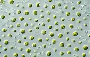 Microalgae or microphytes are microscopic algae invisible to the naked eye. They are phytoplankton typically found in freshwater and marine systems, living in both the water column and sediment.[1] They are unicellular species which exist individually, or in chains or groups. Depending on the species, their sizes can range from a few micrometers (μm) to a few hundred micrometers. Unlike higher plants, microalgae do not have roots, stems, or leaves.[2] They are specially adapted to an environment dominated by viscous forces.