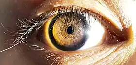 | Miosis from bright light pointed directly at the eye. Pupil measured 2.3 mm in diameter | |