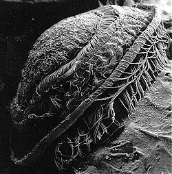 Mobilids possess a conspicuous "adhesive disk" at the aboral (posterior) pole, enabling the organism to attach itself temporarily to its host organism. This disk is radially symmetrical and composed of interlocking curved denticles and associated fibres.[3] The perimeter of the disk can be contracted, allowing it to act as a sucker to hold the ciliate against the surface of its host while it feeds. Because the adhesive disk is a complex and variable structure, and clearly visible in the light microscope, it has been used by taxonomists to differentiate between species and genera within Mobilida.[7]