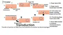 The transformed DNA gets attached to the DNA of E.coli and radioactivity is only seen onto the bacteriophage's DNA. This mutated DNA can be passed to the next generation and the theory of Transduction came into existence. Transduction is a process in which the bacterial DNA carry the fragment of bacteriophages and pass it on the next generation. This is also a type of horizontal gene transfer.[6]