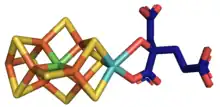 At least 50 molybdenum-containing enzymes have been identified, mostly in bacteria.[5][6] Those enzymes include aldehyde oxidase, sulfite oxidase and xanthine oxidase.[7] With one exception, Mo in proteins is bound by molybdopterin to give the molybdenum cofactor. The only known exception is nitrogenase, which uses the FeMoco cofactor, which has the formula Fe7MoS9C.[8]