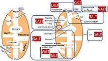 The mucosa-associated lymphoid tissue (MALT), also called mucosa-associated lymphatic tissue, is a diffuse system of small concentrations of lymphoid tissue found in various submucosal membrane sites of the body, such as the gastrointestinal tract, nasopharynx, thyroid, breast, lung, salivary glands, eye, and skin. MALT is populated by lymphocytes such as T cells and B cells, as well as plasma cells, dendritic cells and macrophages, each of which is well situated to encounter antigens passing through the mucosal epithelium. The appendix, long misunderstood as a vestigial organ, is now recognized as a key MALT structure, playing an essential role in B-lymphocyte-mediated immune responses, hosting extrathymically derived T-lymphocytes, regulating pathogens through its lymphatic vessels, and potentially producing early defenses against diseases.[1] In the case of intestinal MALT, M cells are also present, which sample antigen from the lumen and deliver it to the lymphoid tissue. MALT constitute about 50% of the lymphoid tissue in human body. Immune responses that occur at mucous membranes are studied by mucosal immunology.