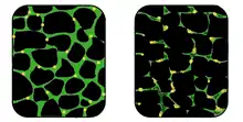 | In affected muscle (right), the tissue has become disorganized and the concentration of dystrophin (green) is greatly reduced, compared to normal muscle (left). | |