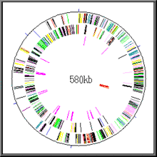 The genome of M. genitalium strain G37T consists in one circular DNA molecule of 580,070 base pairs.[24] Scott N. Peterson and his team at the University of North Carolina at Chapel Hill reported the first genetic map using pulsed-field gel electrophoresis in 1991.[25] They performed an initial study of the genome using sequencing in 1993, by which they found 100,993 nucleotides and 390 protein-coding genes.[26] Collaborating with researchers at The Institute for Genomic Research (TIGR; now the J. Craig Venter Institute), which included Craig Venter, they made the complete genome sequence in 1995 using shotgun sequencing.[24] Only 470 predicted coding regions were identified in 1995, including genes required for DNA replication, transcription and translation, DNA repair, cellular transport, and energy metabolism. It was the second complete bacterial genome ever sequenced, after Haemophilus influenzae.[24] Later data from KEGG reports 476 protein-coding genes and 43 RNA genes, totaling 519.[27] It is unclear where the "525" gene count for the G37T stems from and what gene calling procedure was used.[28]